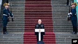 لە مەراسیمێکدا لە کۆشکی مەزنی کرێملن، پوتن دەستی خستەسەر دەستووری ڕووسیا و بەڵێنیدا بەرگری لێبکات.