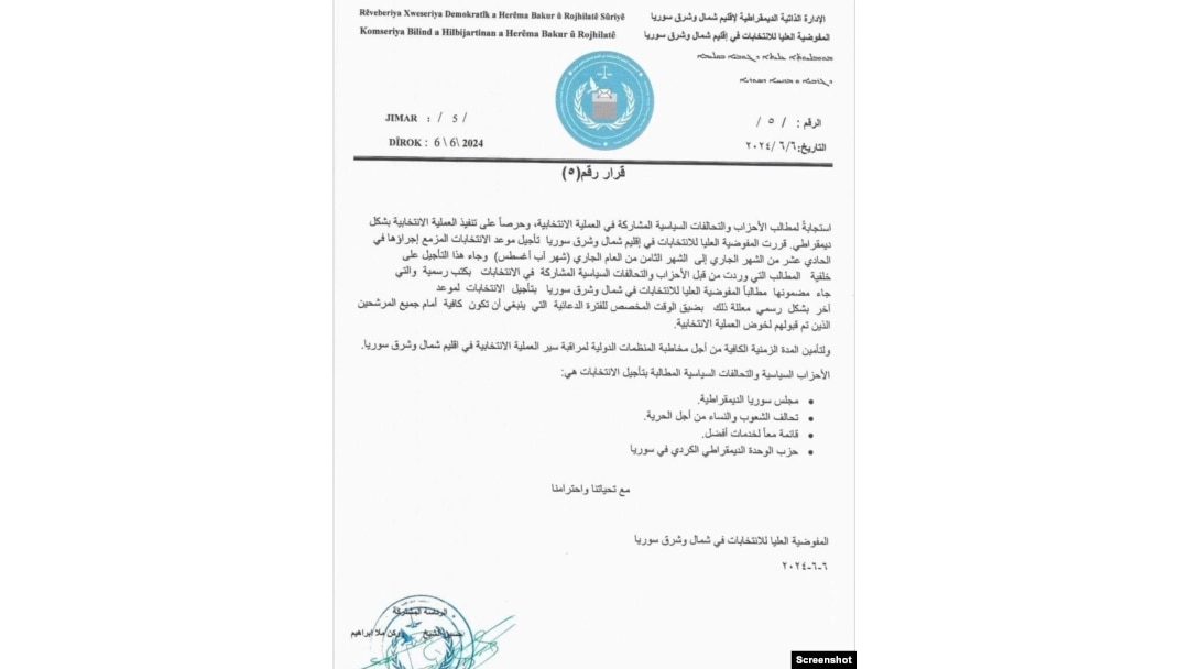 کۆمیسیۆنی باڵای سەربەخۆی هەڵبژاردنەکان لە باکور و ڕۆژهەڵاتی سوریا ڕایگەیاند هەڵبژاردنە خۆجێیەکانی ناوچەکانی بەڕێوبەرایەتی خۆسەر، دوا دەخرێن بۆ مانگی 8ی داهاتوو.